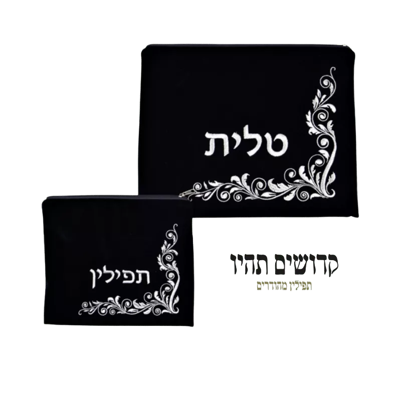 סט תיק לתפילין וטלית בצבע שחור עם רקמה כסופה