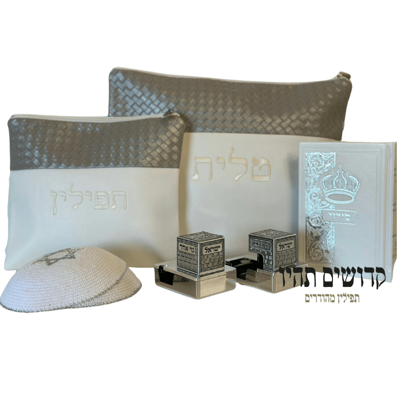 כיסוי לטלית ותפילין דמוי עור, בתים לתפילין, טלית אקרילן עם רקמת כתר, סידור מהודר עם כתר, 2 כיפות וכיסוי pvc להגנה מרטיבות.